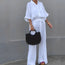 Stijlvol Ontwerp: Losse blouse met knoopsluiting en hoge taille broek met een elegant strikdetail.